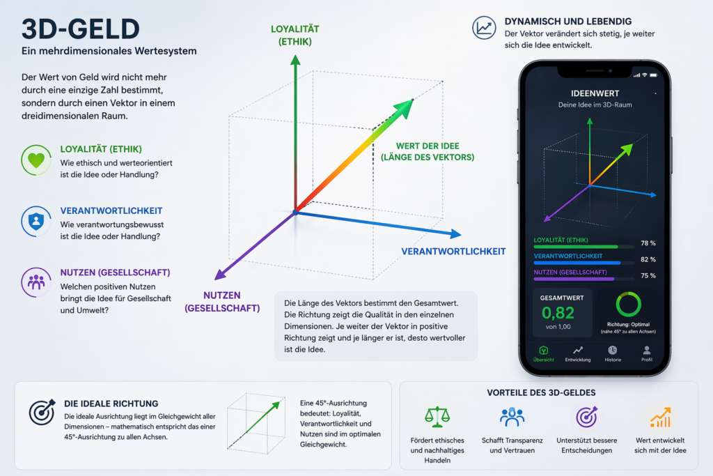 Die Idee des 3D-Geldes basiert auf der Annahme, dass der Wert von Geld nicht ausreichend durch eine einzige Dimension beschrieben werden kann. Stattdessen wird Geld als Vektor in einem mehrdimensionalen Raum dargestellt.